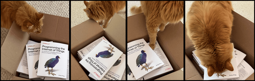 - One of our cats loves boxes. He was probably figuring out how to remove the books so he could claim the box as his own. Or maybe he really wanted to start Programming the Internet of Things… Cats think everything belongs to them, of course.